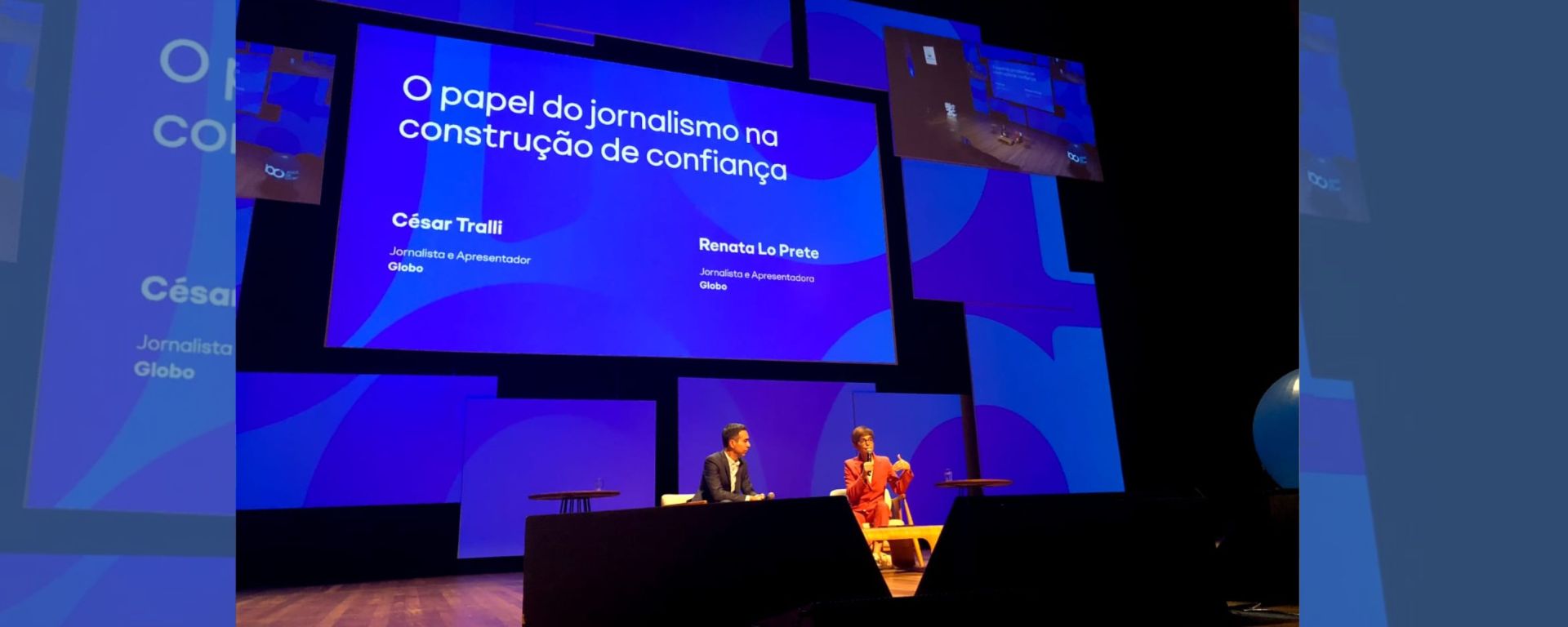 Em mesa realizada no Summit Acontece Globo durante a edição de 2025 do Rio2C, os jornalistas César Tralli e Renata Lo Prete marcaram presença no evento para conversar sobre o papel do jornalismo na construção da confiança nos dias atuais. A conversa durou uma hora e foi realizada no GlobalStage, auditório da Cidade das Artes, complexo cultural localizado no bairro da Barra da Tijuca, no Rio de Janeiro.