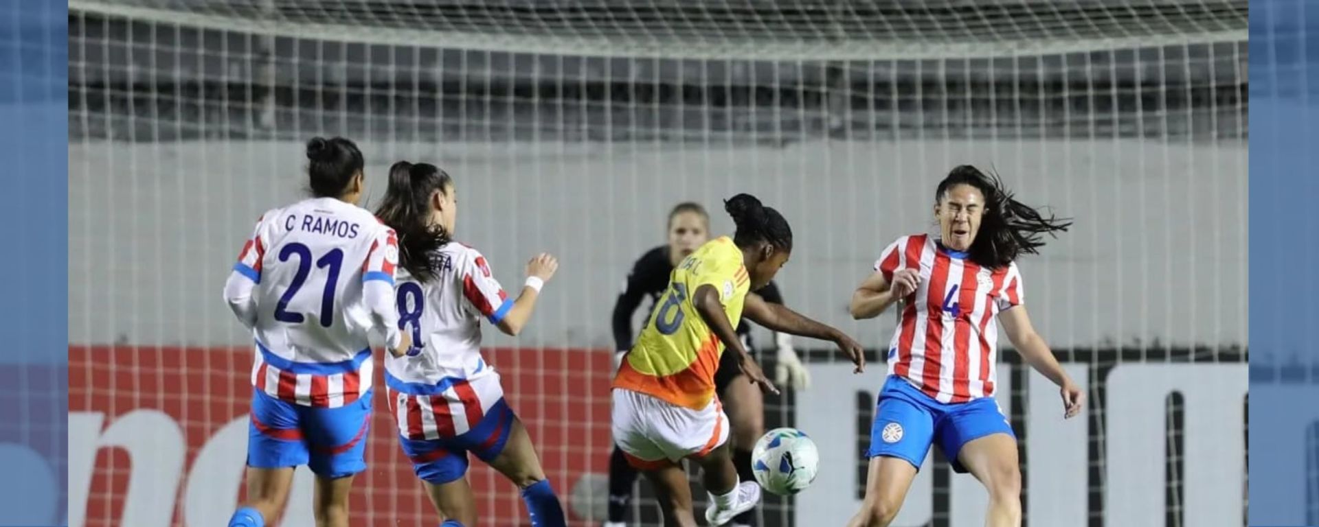 Para afastar a má atuação da estreia, a Colômbia começou forte a primeira etapa. Dominando as ações, as Cafeteras logo abriram o placar. Em boa troca de passes coletiva aos 13 minutos, Linda Caicedo tabelou com Leicy Santos e finalizou da entrada da meia lua da área no canto direito da goleira Soledad Belotto, marcando um belo gol, o primeiro das colombianas na competição. Porém, a alegria durou pouco, já que dois minutos depois, aos 15, Claudia Martínez aproveitou sobra de lançamento e chutou de primeira da entrada da área no canto baixo direito da goleira Katherine Tapia, empatando o jogo para as paraguaias. Mesmo com o empate rápido, a Colômbia não se abateu e seguiu em cima das paraguaias buscando o gol de desempate. Na melhor chance, Linda Caicedo finalizou dentro da pequena área aos 30 minutos, obrigando a goleira paraguaia a fazer grande defesa. Apesar da pressão das tricolores, as duas equipes foram para o intervalo em igualdade. Nos números, o tom da superioridade: 77% de posse de bola, seis finalizações, todas no gol paraguaio, cinco escanteios e 257 passes trocados, contra apenas 75 das paraguaias.