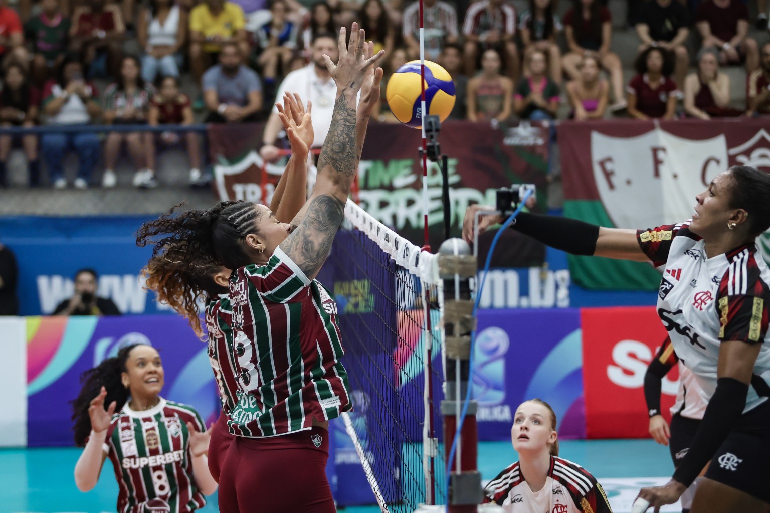 Após o tempo técnico, o Fluminense voltou mais agressivo e ampliou a vantagem com Amanda Campos, que colocou 20 a 17 no placar. O Flamengo respondeu, encurtando a diferença em ataques de Simone Lee e Tainara, enquanto Ariane mantinha o time tricolor à frente em momentos decisivos. A reta final se transformou em um duelo de nervos, com troca constante de pontos e intervenções dos dois técnicos. Quando Ariane marcou o que seria o ponto de set, o desafio de Bernardinho mudou a história da jogada ao revelar toque na rede de Fabíola, dando a virada ao Flamengo. A partida seguiu dramática, com sucessivos empates, viradas e set points salvos pelos dois lados. Lara chegou a colocar o Fluminense em vantagem novamente, mas o Flamengo respondeu com Karina e depois se beneficiou de um toque na rede de Amanda Campos. Mesmo assim, o empate persistiu até que Valdez errou o saque, abrindo caminho para o desfecho. Na sequência, Simone Lee subiu firme no bloqueio para parar Ariane e garantir a vitória rubro-negra por 30 a 28 no primeiro set.